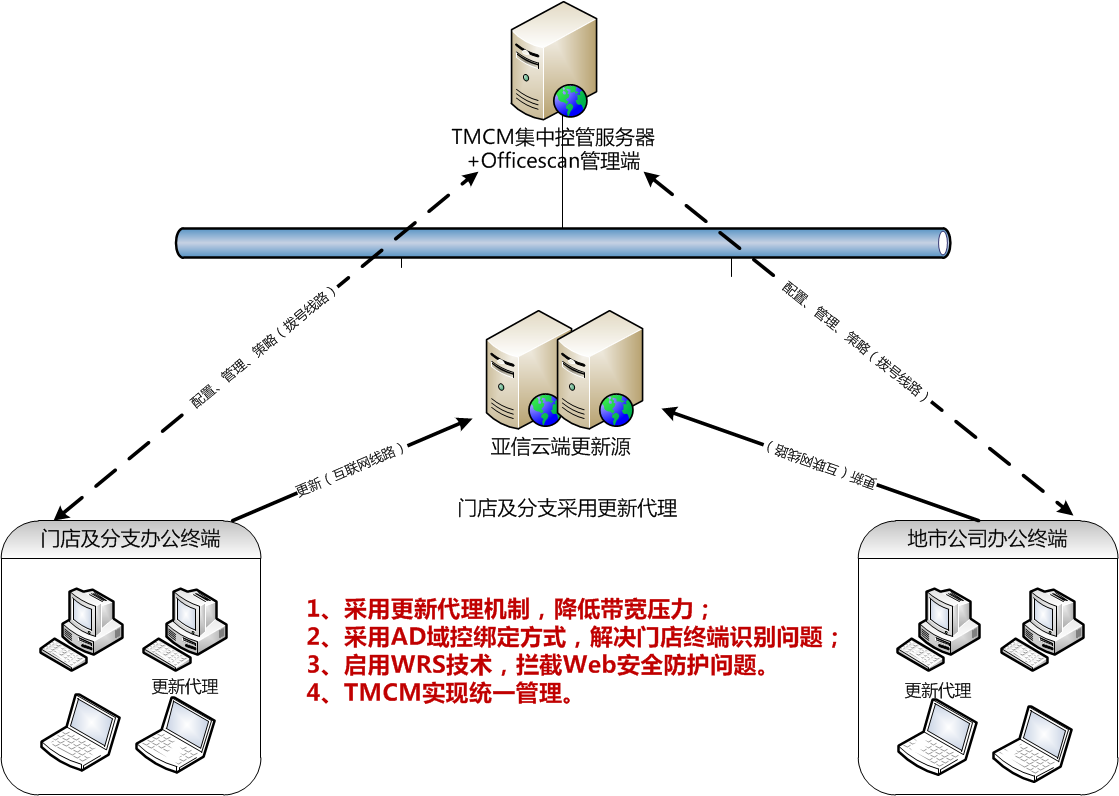 亞信安全終端安全解決方案(Officescan11.0 + TMCM),有效地解決了連鎖企業(yè)這種分散式終端的安全管理難題。
